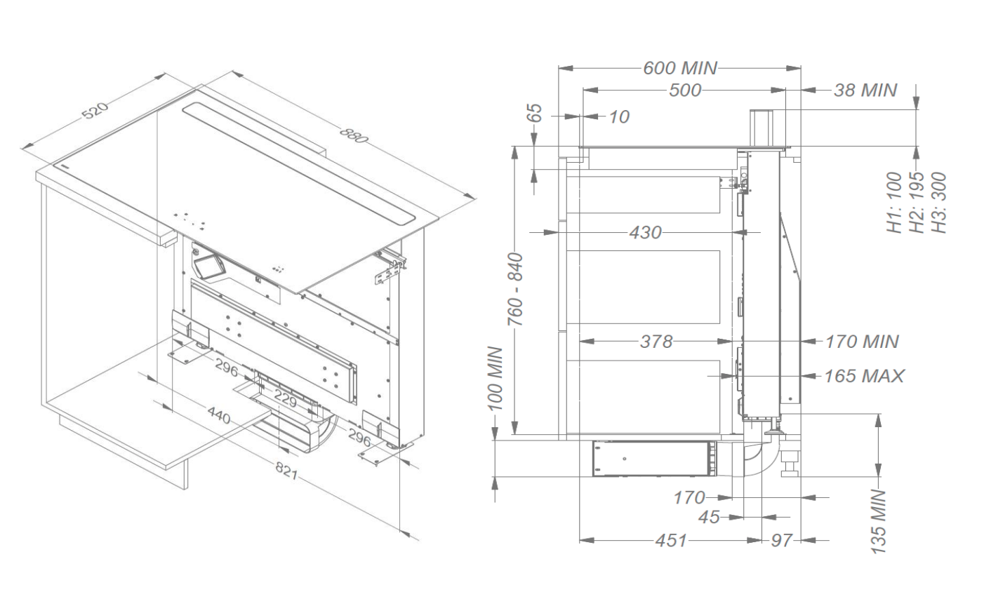 Afmetingen dampkap (mm)